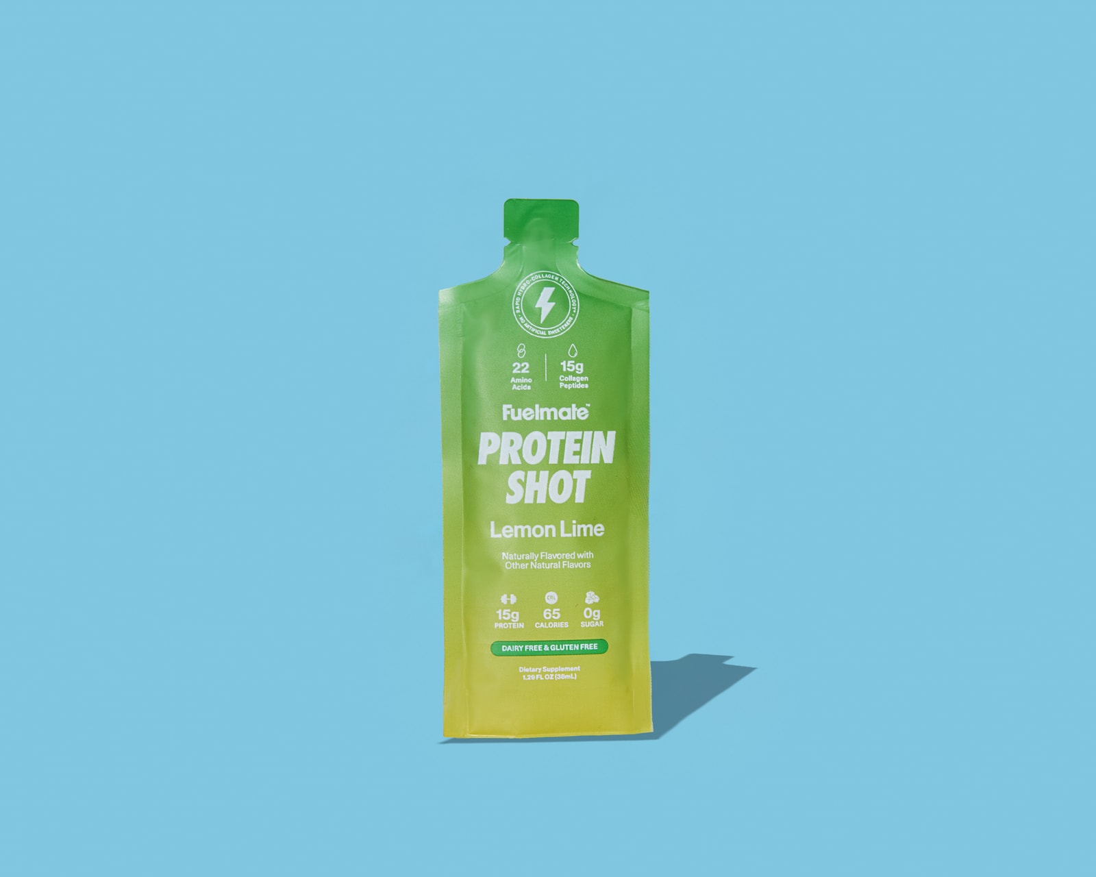 A 1.29 fl oz protein shot packed with 15g of complete collagen protein, 15g of collagen peptides, and all 22 amino acids. 65 calories. Zero sugar. No artificial anything. Rip the top, drink it, go — no shaker required, no cleanup, no excuses.